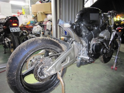 23:07 フルカウルを装着しようと フロントフォークの曲がりは、予想していなかった・・・・。、と言うより、現実から目をそむけていたので、部品は注文してありません。 時間も押してきたので、今日の修理はこれまで。 とりあえず、フルカウルを装着して、撤収の準備をすることに。 『ふっ!フルカウルが付きません!』 (?_?) メータ周りのアッパーカウルステーも曲がっているみたい・・・・。 これも、新品に交換しないと・・・・ (^0^;) もう、笑うしかありません。『あははははぁ』 『あぁ〜あぁ』 (T_T) 本日、これまで! |