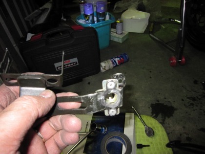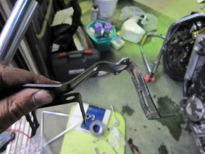 22:21 叩いて、直す! カウルの取付金具のリベットをはずして、ステーだけにして、叩いて修正。 と、言っても結構曲がっちゃってますね。(笑) 叩いて、まあ大丈夫なところまで直して、取付完了。 |