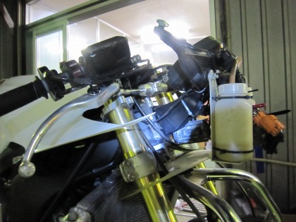 22:12 カウルステー 続いて、フルカウルの取付。 左側のカウルステーはくっちゃり曲がっちゃってます。 これは修正できそうもないので、交換。 |
