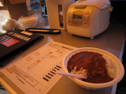 8:17 朝食です マシンの準備が終わったところで、朝食。 朝食は、朝からちょっとヘビーにカレーライス。 今回は、電気ポットと炊飯器を持ち込み。電源もないので、タイヤウォーマと兼用で発電機で炊飯。 今回は土曜の練習、日曜日のレースと2日間通しで西コース。 西コースのパドックには食堂も売店もなく、近くのコンビニまでも歩いていける距離ではないので、自炊道具は必要ですね。 でないと、コンビニで買いだめした弁当でも食べるしかありません。 |
