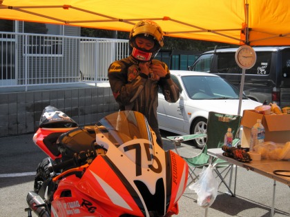 | 13:35〜14:15 特別スポーツ走行 2本目 特スポの2本目が始まりました。 走行も後半になり、FUJIhide選手、が戻ってきません。 やっちゃったみたいです。 しばらくして、自走でピットに戻ってきました。 話を聞くと、西コースのUターン箇所で転倒したとのこと。 速度が低かったので、ハンドルを修正して、ふたたび走行に戻りました。 |