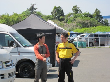 10:05 ダンロップタイヤさん FUJIhide選手は、1走行目の感触を伝えながら、ダンロップタイヤの担当者と打合せ。 |