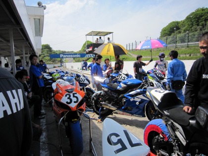 14:19 ピットレーンに 前のクラスのGP3のレースが終了した時点で、マシンをピットレーンに移動。 ライダーがまだ来てないんですが・・・(汗) |