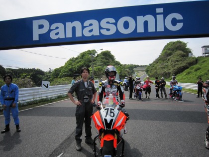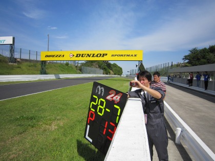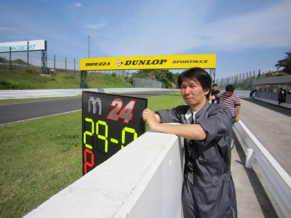 14:51 レース終了 10周目、2位で転倒した選手が猛烈な追い上げで、Fujihide選手をパス。 追い上げた選手は国際のライダーでした。 ポジションを1つ落として、13位。 この周、追い抜かれたライダーを追いかけ、ベストラップ。 28秒台にタイムを入れました。 これで、予選のベストを1秒短縮。 絶対的な練習量が足りていないので、走れば走るほどタイムが上がっていきます。 そして、12周のレースにチェッカー。レース終了です。 レプソル21原さんも、ボードを出しながら、写真撮影と忙しい。 『お疲れ様でした!』 |