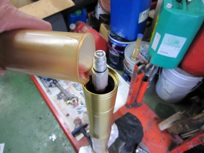 18:12 規定量は アウターチューブにインナーチューブを組み付けたら、フォークオイルを入れます。 (フォークスプリングはまだ入れないでね!) ノーマルの規定量は、362cc。 330cc以下にしてくれれば、500ccのボトル2本買えば、3本分使えるのに! (普通は、2本分で十分なはずですよね・・・? ^^;) |