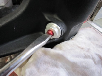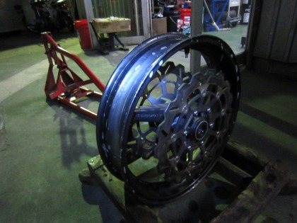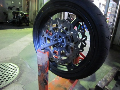 23:32 タイヤ交換 そして、今日最後の〆は、タイヤ交換。 今までは、転倒したときに付いた芝生だらけ(笑)の終わっているタイヤが付いていたので交換します。 フロントの取り外し、完了。 |