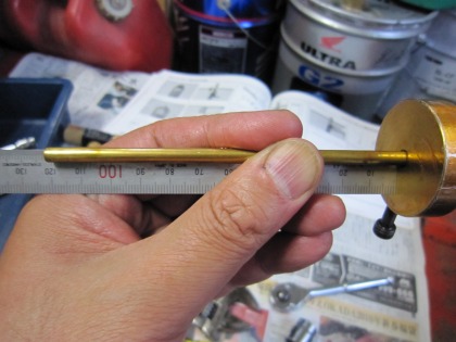 18:20 オイルレベル インナーチューブにフォークオイルを入れて、しばらく放置したら、オイルレベルの測定。 標準のオイルレベル 120mm。 |