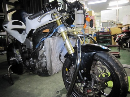 1:09 修理完了! 修理完了しました。 アンダーカウルは、ラジエーターが干渉して、取付ができず。 オパミンが購入時にHRCの大型ラジエータに変更していたため、ノーマルのカウルではぶつかって取付ができませんでした。 なので、アンダーカウルを藤巻さんが、一生懸命削って、どうにか取付可能に。 |