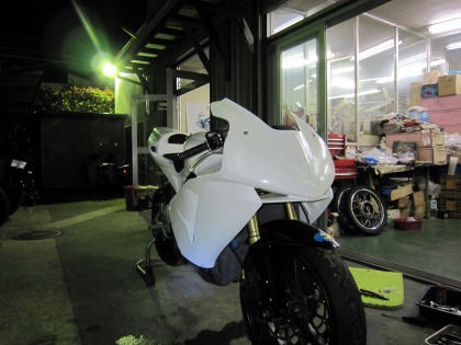 22:08 だんだん形に ラジエータの取付も終わり、アッパーカウルブラケットも交換したので、アッパーカウルも取り付けました。 でも、まだ。 ほら、スクリーン付いてないでしょ。 アンダーカウルもね! |