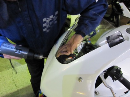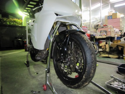 23:23 まだぁ? まだ、終わりません。(汗) スクリーンとアンダーカウルの取付を藤巻さんにお願いしている間に、自分はステップの曲がりを修正。 かなりテンパってきました。 ステップの写真も取り忘れ。(~o~) |