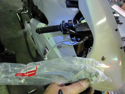 19:54 アッパーカウルブラケット こちらも、前回の修理で、曲がっていることが発覚したアッパーカウルブラケット。 こちらも、おニューでございます。 なんか、古いの外してみたら、あまり曲がっていないみたい? 変な形しているので、曲がっているのが大丈夫なのか良くわからない。 新品、取っちゃった(買っちゃった)ので、あまり深く考えずに交換。 |