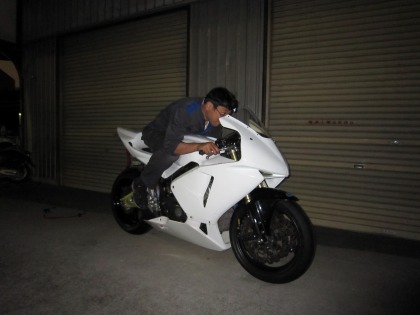 1:11 とりあえず跨ってみる 修理が完了して、とりあえず跨ってみる。 新品のカウルが、遠目で新車のように・・・・(見えない?) |