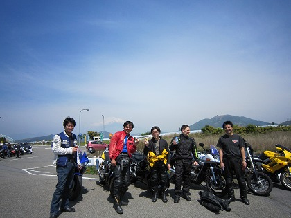 9:57 とりあえずバラッと とりあえず、そろったところで、とりあえずパラッと集合写真。 後ろのバイクは見えていないし、富士山をバックに・・・・って、見えないね。 かなり適当。(笑) |