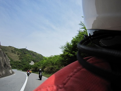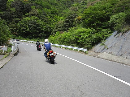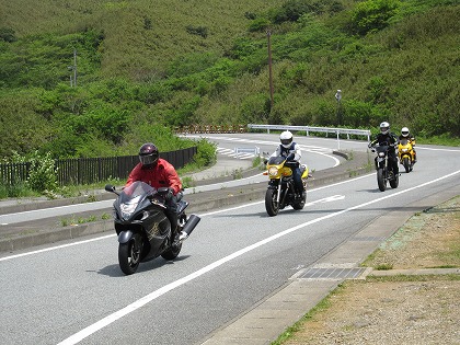 10:21 後方は 後方は、CRM250に乗るドイツから来たボールデさん、ハヤブサのプーさん、VTRのみっちゃんと続きます。 今日は6台でのツーリング。 ※ ボールデさんが乗るバイクは、最初D-Trackerと思っていました(だって、ホイルかホークにD-trackerって書いてあるんだもん)が 、本人からCRM250であるとのご指摘がありました。 訂正して、お詫びします。 |