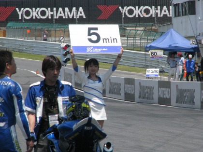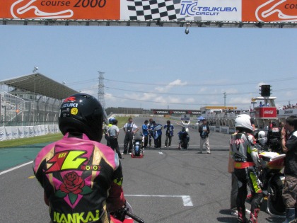11:54 2ヒート目、準備 約15分ほどの中断の後、2ヒート目のレースが始まります。 1ヒート目と同じように、まずはピットロードからコースインして、グリッドに着きます。 『1日に2回もレースができてイイね!』なんて、周りに言われてます。 |