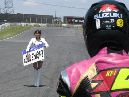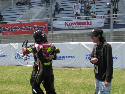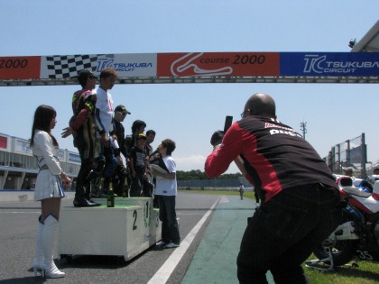 12:19 誰を撮っているのかな? 表彰台で、元世界GP125ccクラスのチャンピオン坂田さんがインタビューしている間、ハルナ海坊主さんは携帯カメラで一生懸命に撮影中。 撮影しているのは、入江選手? or レースクィーンさん? 『もちろん・・・(笑)』 |