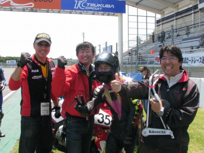 12:28 表彰式の後、1位〜4位はマシン保管でお預け。 テントに戻ってきて、もう一度記念撮影。 TC600、決勝2位。ベストタイムは1分2秒5で卒業タイム。 (今シーズンは、TC600に参戦できるが、ライシーズンはエントリーできないらしい) ハルナ海坊主さんも入江選手も2秒5、自分は4秒で止まったまんま。 なかなか、復帰しにくい状況だ (^_^;) まあ、歳も歳なので、年齢を言い訳にすれば良いので、気軽に行こう! 特に入江選手については、まだ二十代で伸び代もある。まだまだ、タイムは縮まるだろう。 次戦からST600クラスに出場するとのことなので、期待しよう! |
