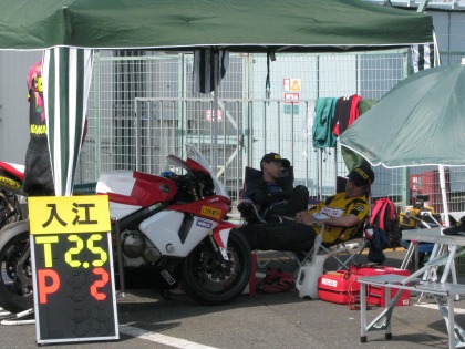 14:32 爆睡 モナークでカレーを食べた後、テントに戻って爆睡! 入江君、ハルナ海坊主さんはわかるが、浦河くんもマシンの影で地面の上で寝ている。(笑) 『お疲れさんでした!』 自分はST600の決勝を観戦するために、移動します。 |