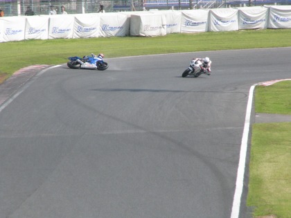 12:07 3番手も食い下がる 3番手の選手も、入江選手の背後まで迫り、食い下がります。 3番手は、トライアンフのデイトナ675、3気筒のマシンです。 トップのR6には、一時背後まで迫るものの、0.3秒ほど前を行かれ、抜くまでにはもう少し。 |