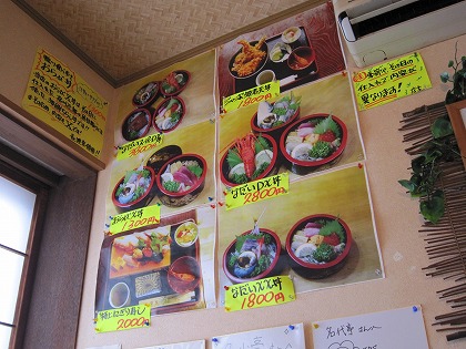 11:30 注文は 店内はテーブル席が2つ、小上がりにテーブルが2つ、と結構コンパクト。 混んでいる時間にきたら待つことを覚悟しないとダメですね。 自分たちが入店したときは、昼前だったので、すんなり小上がりに座れましたが、昼になってお客さんがボチボチやってきました。 注文は壁に貼ってある、お薦めメニューから選んで。 ”名代XX丼(¥1,800)にしました。 Xは、時期や仕入れでネタが変わるので、Xだそうです。 |