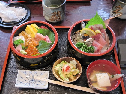 11:45 ドンと ドンブリを広げると、左のドンブリが海鮮丼、右がお造りになっています。 美味しそう。 さっそく、『いただきます!』 ウニは千葉県内産だそうで、濃厚な味で美味しい。 右のドンブリには、やはり千葉県でよく上がる鯵の刺身。 鯵は美味しい季節ですね。 姫サザエも薄めに味付けされ、柔らかく上品に煮付けられています。 お椀が旨い! アラの出汁がよく利いて、旨いです。 (^o^) |