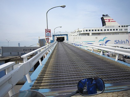 9:46 乗船開始 四輪車の積み込みが早く終わり、予定より早くバイクの乗船が開始です。 『さようなら、本州!』 タラップのところに一時停止して、写真をパシャリ! お盆の繁忙期にこんなことしていたら、作業員さんに怒られるのは必至だ。 |