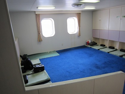 9:55 二等 バイクを駐めて居住エリアに上がってきました。 部屋は一番安い二等。 別に金が無い訳じゃないんだけど、(と言って、あるわけでもないんだけど (-_-;))、なんとなく、この雑魚寝部屋じゃないと、自分としては、フェリーに乗った感が出ません。 部屋は14人部屋ですが、今日は7人で使用。 お盆の時期だと、ほぼ満員になるので全然余裕ですね。 |