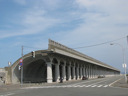 14:23 北防波堤ドーム ノシャップ岬で昼食を食べた後、稚内港にある北防波堤ドームへ。 昭和の初期、稚内港を守りつつ、内側を通路として使用できるように作られた防波堤で、北海道遺産に指定されている。らしい。 |