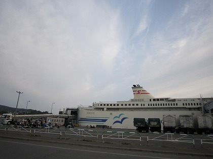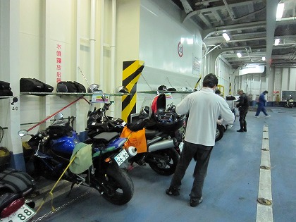 4:25 カーデッキへ 着岸前になり、カーデッキへ。 バイクに荷物を積み直し、下船の準備をします。 バイクの下船は四輪車が済んでから、一番最後の下船になります。 |
