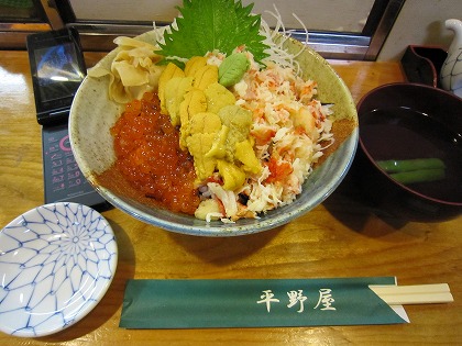7:09 で、注文は、欲張って。 ウニ、イクラ、カニの三色丼(¥2,000) アスパラのお吸い物付き。 (朝食からお金かけすぎだ!) やっぱ、関東の人間からすると北海道と言えば、ウニ、イクラ、カニが王道。 他に、ホタテやホッキ貝、サーモンにイカなんかもあるけど、食材が増えれば良いってもんじゃないよね。 ウニは新鮮で美味しい。 関東で食べると結構形が崩れちゃったりしているのが多いんですよね。 もちろん、とっても高いお金を払えば別ですけど。 イクラの醤油漬けも、イイ塩梅です。 (^o^) カニは、水分が抜けて、ちょっとパサパサ。ちょっと残念。 |