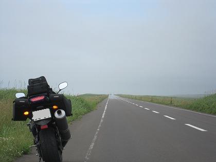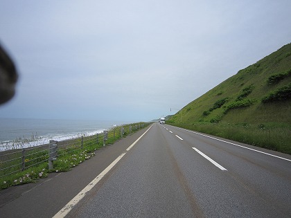 10:32 国道232号線 留萌の市街地から、今度は国道232号線で稚内方面を目指します。 海岸線は険しさが無くなり、ただただひたすら一直線。 湿気が高く視界が悪いので、真っ直ぐに延びた道の先、どこまで続いているのかわかりません。(汗) 恐るべし、北海道。(*_*) |