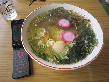 13:42 ホタテラーメン 注文はホタテラーメン。(¥1,000) 朝、贅沢をしたので、少し抑え気味に。 でも、旅行中だから、いつもよりかは奮発。 昆布と貝だと思います。 あと鶏ガラ出汁の少し濃いめ目の塩味スープ。 ちょっと不思議なな味ですが、結構いけます。 麺は、中くらいのちぢれ麺で、スープが良く絡みます。 ホタテはちょっと煮すぎて固くなっていたのが、少々残念。 ご馳走様でした。 |