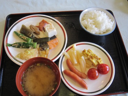 8:13 朝食 朝食はバイキング形式。 昨晩、ビールを飲み過ぎた感があるので、少し抑えての朝食にします。 |