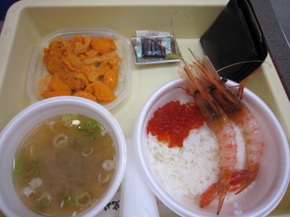 12:01 勝手丼 まずはウニ。 ウニはせっかくなので、塩水ウニ!(バフンウニ) 1パック¥1,600 そして、ボタンエビ。 一匹¥250×2匹 = ¥500。 これは、ちょっと割高ですね。 市場内の普通の魚屋さんで買えば、10匹で¥1,500くらいで買えます。でも、小分けにしてくれないので、しょうがなくちょっと割高。 その他に、塩分が足りないかなぁ〜。なんて思って、イクラ。(\300) あと、カニのみそ汁(¥100)を付けて。 \200+\1,600+\500+¥300+\100 = ¥2,700也 ちょっと贅沢しすぎだぁ。(>_<) さっそく、『いただきます』 |