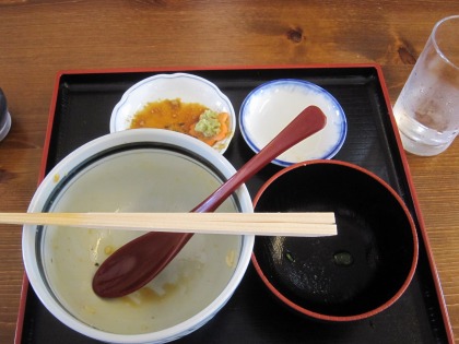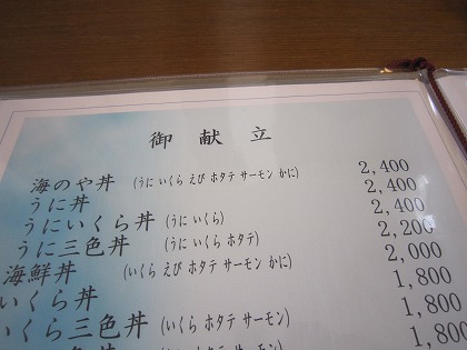 11:40 注文は 迷う。 (@_@) 実質、北海道ツーリングでちゃんと選べる最後の食事になる可能性大。 迷います。 ^^; 「釧路の和商市場で食べたウニ、美味しかったなぁ〜」 「やっぱ、ウニの本場積丹半島にきて、ウニは外せないよなぁ〜」 「カニもちゃんと食べてないなぁ〜」 「そう言えば、今はスルメイカの季節だよなぁ。イカ食べてなかったなぁ」 「イクラ・サーモンは時期じゃないし。関東でも食べられるし・・・」 などと、今回の北海道ツーリングで食べたものを思い出しつつ、注文に迷います。 |