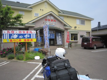 11:39 昼食です 余市を過ぎて国道229号線に入ると沿線には、 ”ウニ丼” ”海鮮丼” ”生ウニ丼” ”海鮮丼” ”ウニ丼” の幟(のぼり)が目に飛び込んできます。 北海道ツーリング最後の昼食は、魚介類で〆ますか。(^_^)v ちょっと早いですが、ここで昼食にします。 入ったお店は、神威岬にほど近い余別にある、民宿 お食事処 海のや さん。 さっそく入ってみることにします。 |
