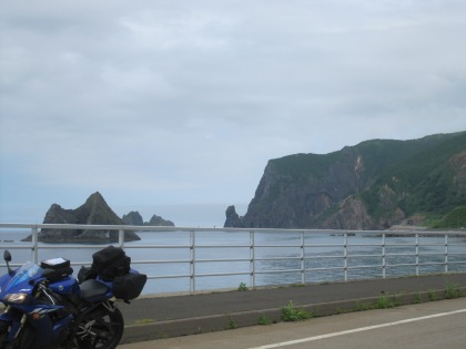 12:11 積丹半島の 積丹半島の西側は荒く削り取られた岩肌が海岸線ぎりぎりまでせまっています。 積丹半島西側の国道229号線は交通量も少なく、快適な路線です。(平日だから?) また、景色を眺めながら走るにも、最適に路線です。 ただし、トンネルも多く、トンネル内の路面は湿気でウェット状態のため、注意が必要です。 |