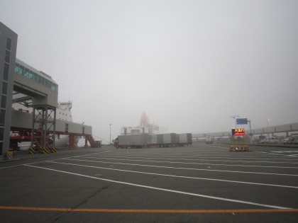18:17 フェリー埠頭 夕食を食べ、フェリー埠頭に戻ってきました。 夕方便のフェリーは、乗船も終わり、間もなく出航の予定。 積み込みの終わった埠頭は閑散としています。 フェリー埠頭にいるのは自分一人。 |