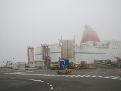 18:22 フェリー埠頭に 夕食を食べ苫小牧のフェリー埠頭に戻ってくると、夕方便は出航間近でした。 霧雨の中、出航の準備が進みます。 |
