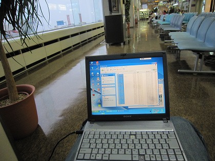 18:51 待合室で フェリー乗船まで、まだまだ時間があるので、バイクを埠頭に駐めて、待合室に移動。 待合室の外れにある電源が取れるシートに座り、パソコンを立ち上げ、ツーリングで撮った写真の整理をして待ちます。 ソロツーリングをしていると、深夜など意外に時間を持て余すことがあります。 そんなとき、パソコンは時間潰しにもってこいのツールですね。(重いけど・・・) |