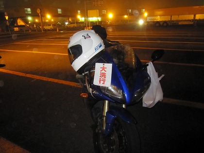 21:55 手続きをすませて 深夜便の乗船手続きは21時から。 乗船の手続きを済ませ、R1のもとへ。 窓口で渡された、”大洗行き”の札をつけておきます。 ミラーに下げてあるコンビニ袋は、明日の朝食と昼食。 乗船手続きをしたときに知ったのですが、深夜便には、食事を提供するところがないそうです。 そのため、フェリーが大洗に到着する翌日の夜まで、食事は自前で調達しておかなければなりません。 夕方便と¥6,900も差があるのは、食堂が”あるなし”も理由ですね。 |