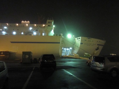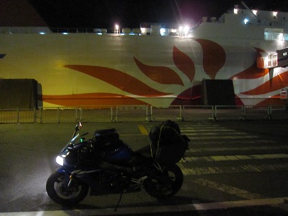 23:10 ぼちぼち乗船 深夜便のフェリーは、夕方便のフェリーが出航した1時間ほど後で入港。 まずは、車両の積み出しをしていました。 積み出しが終わり、23時頃から乗船開始。 バイクに跨り、乗船を待ちます。 夕方便は30台ほどのバイクがいましたが、深夜便はわずか3台。 人気無いんだねぇ。 ^^; これじゃ、大幅にディスカウントするわけだ。 お盆時期の超混雑がウソのよう。 ただ、四輪車も少なくて、深夜便が廃止になってしまうんじゃないかと、心配になるくらいだ。 |