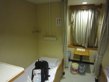 23:18 船室に フェリーに乗船して、船室まできました。 行きの新潟便は大広間でしたが、この便は最低がこの4人部屋。 結局、この4人部屋も、他にだれもこなくて一人で使うことに。 |