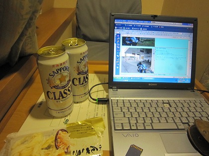 7月3日(土) 0:16 日付がかわって 日付がかわって、7月3日土曜日になりました。 入浴後、部屋に戻って、缶ビールを飲みつつ、パソコンでツーレポを作成。 缶ビールはこのツーリングでしっかり定番となった北海道限定 SAPPORO CLASSIC (北海道限定ですが、フェリーの中では買えます) 出航の25:30になる前に、眠たくなって寝てしまいました。 ビールのロング缶、2本飲んだからね。(笑) |