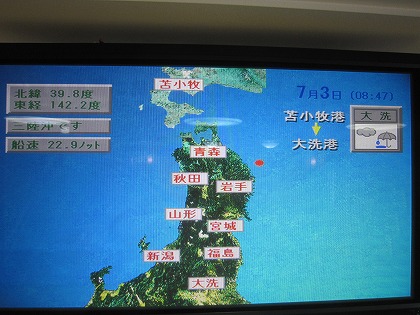 8:46 三陸沖 船室を出て案内所にあるディスプレイを見ると、フェリーはまだ三陸沖。 まだまだ先は長いね。 |
