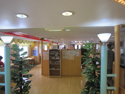 8:52 ホール 船室から出て、カップ麺のお湯を取りに、共用エリアのホールに行く。 もともとは、食事をするスペースだったんだろうけど、今はテーブルとイスが置いてあるだけ。 清涼飲料水とか缶ビールの自動販売機が数台と、高速のパーキングエリアとかあるホットドッグとかハンバーガーの自販機が置いてあるだけです。 |