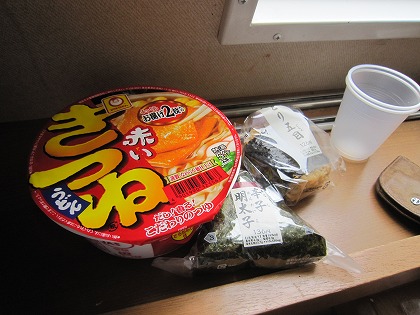 8:59 朝食 朝食です。 朝食は”赤いきつね”と”おにぎり”。 かなりわびしい。(>_<) 朝食を食べた後は、やることが無いので、当然ツーレポの作成。 昼近くになって、少し飽きて、眠たくなったので昼寝。(-_-) |