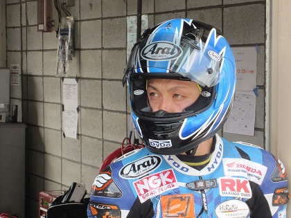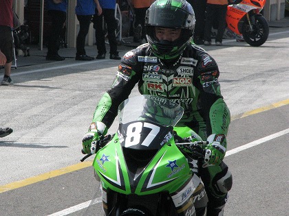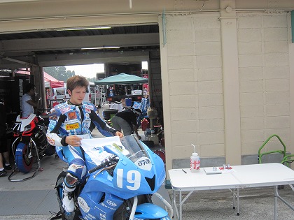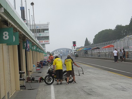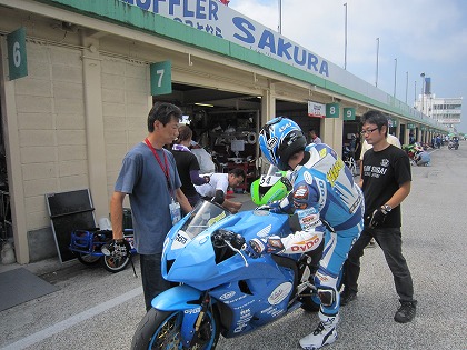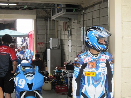 9:56 予選開始 9:55定刻に40分間の公式予選が開始になりました。 ライディングの準備を終えた國川選手はピットで待ちます。 |