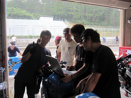 7:59 セッティング中 予選前に、昨日までの練習走行の結果から、インジェクションのマップを確認中。 この後、HONDAの人が来て、マップについて打合せ、少し変更したみたいです。 |