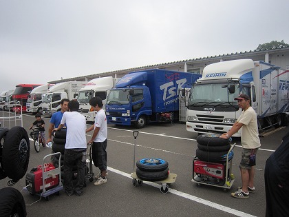 9:25 タイヤを装着 マーキングが終わったタイヤをマシンに装着。 マシンはチェック済。 あとは9:55からの公式予選が始まるのを待つだけです。 準備が終わって、この待ちの時間は長く感じますね。 |